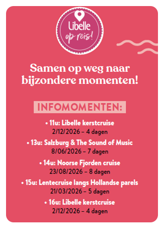 Vergeet zeker niet langs te gaan bij de stand van onze reispartner Lauwers. Daar ontdek je de prachtige reizen die in 2026 worden georganiseerd voor de Libelle-lezeressen.